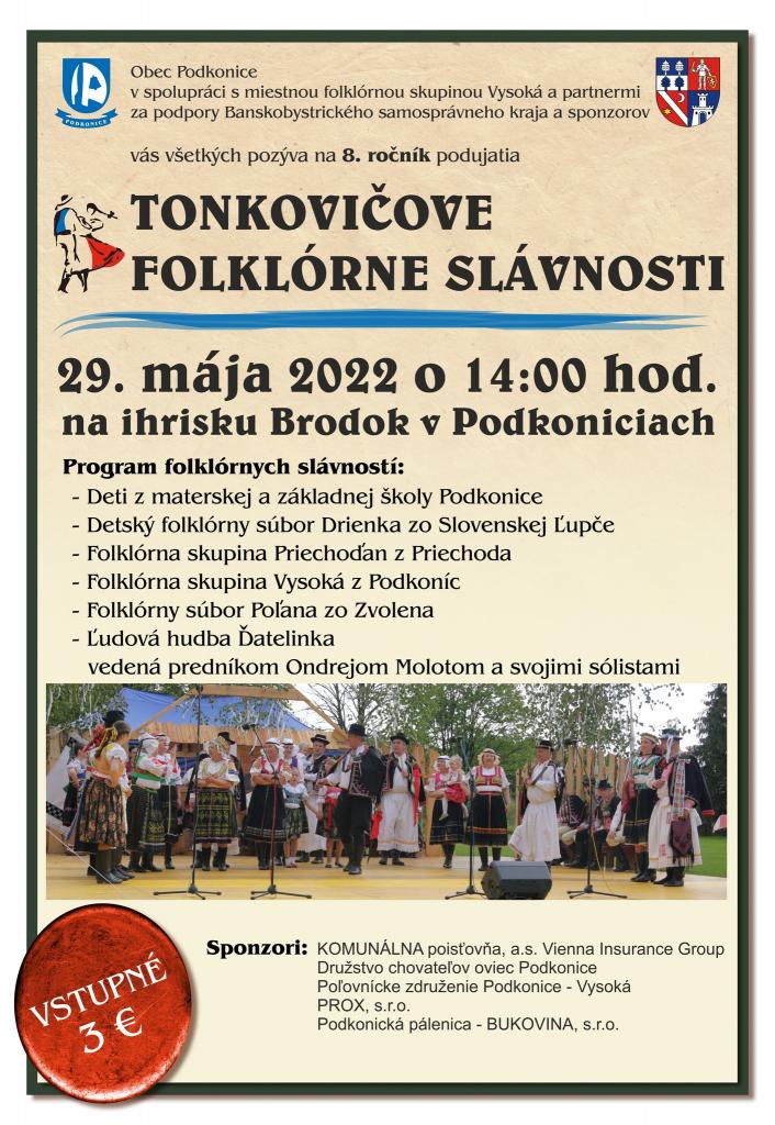 Obec Podkonice, v spolupráci s miestnou folklórnou skupinou Vysoká, s podporou Banskobystrického samosprávneho kraja a sponzorov vás všetkých srdečne pozýva na 8. ročník podujatia Tonkovičove folklórne slávnosti. Sviatok podkonického folklóru a program na počesť nášho rodáka prof. Pavla Tonkoviča sa uskutoční poslednú májovú nedeľu - 29. mája 2022 na futbalovom ihrisku Brodok v Podkoniciach. Stane sa tak po trojročnej pandemickej pauze.